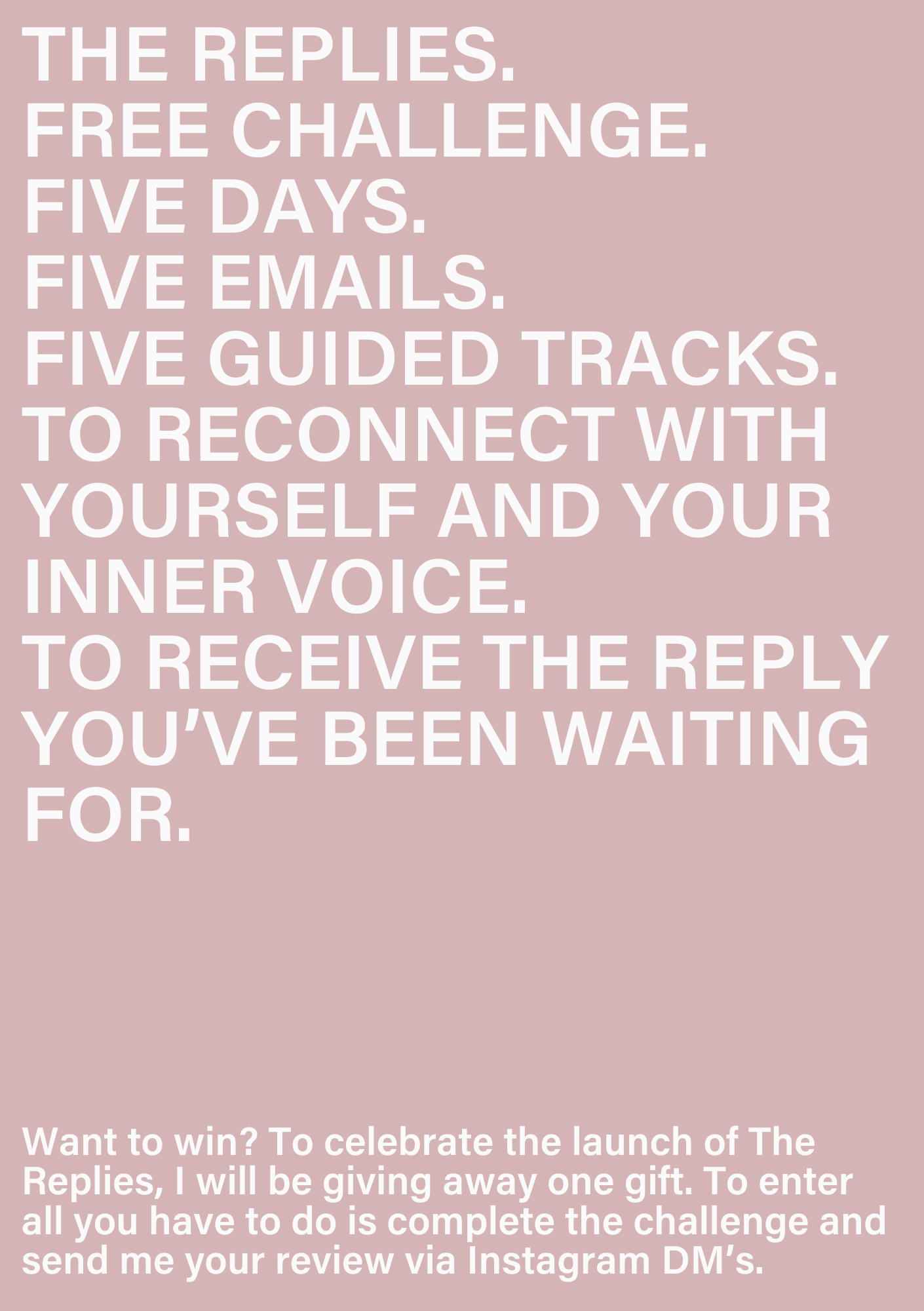 The Replies is the FREE five day self connection challenge, with daily guided tracks, delivering the reply you’ve been waiting for (from yourself!) You really do have all of the answers within, and this five day challenge will help you tune inward and actually start listening. To your inner voice, your intuition, your gut feeling, your inner child, your higher self, your spirit guides, your subconscious mind. To give you the inner wisdom and the reply you’ve been waiting for.